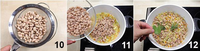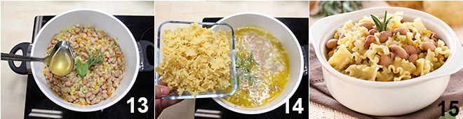 e adicione o caldo de legumes 13, depois leve para ferver. Cubra tudo com uma tampa e cozinhe por cerca de uma hora e meia, verificando de tempos em tempos os feijões, que devem estar tenros, mas não desmanchando (se secarem demais, adicione mais caldo ou água quente). Quando os feijões estiverem tenros, adicione o macarrão 14 e cozinhe pelo tempo indicado na embalagem, mexendo frequentemente para evitar que grude no fundo. A sopa de macarrão e borlotti está pronta: sirva-a bem quente, com um fio de azeite de oliva extravirgem a cru.