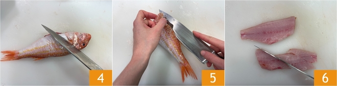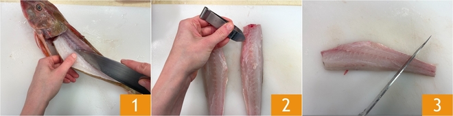 Para preparar a sopa de peixe, comece limpando os peixes: eviscere e lave a galinheta, depois remova as barbatanas. Faça um corte nas costas e obtenha os filés passando a lâmina afiada de uma faca ao longo da espinha central a partir de cima 1. Corte a parte da barriga dos filés, depois remova as espinhas com uma pinça de cozinha 2. Por fim, corte os filés em pedaços 3. Reserve as sobras da limpeza porque você precisará delas para o caldo.