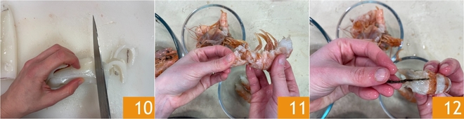 Agora pegue as Como limpar as lulas e corte-as em tiras 10. Por fim, Como limpar os camarões: remova a cabeça, a cauda e a carapaça 11, depois com um palito de dente retire o fio preto que fica nas costas 12.