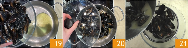 Enquanto isso, cuide dos Como limpar e abrir mexilhões: em uma panela grande, aqueça um fio de óleo com um dente de alho, depois adicione os mexilhões 19 e cubra imediatamente com a tampa 20. Cozinhe em fogo alto apenas o tempo necessário para que se abram, agitando a panela de vez em quando. Assim que os mexilhões se abrirem, escorra-os e recolha a água de cozimento em uma tigela 21, depois filtre-a.