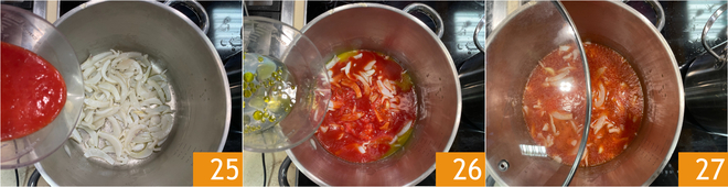 Despeje o vinho branco e deixe evaporar completamente, em seguida, acrescente o purê de tomate 25 e a água filtrada dos mexilhões 26. Cubra com a tampa 27 e cozinhe em fogo médio por 25 minutos.