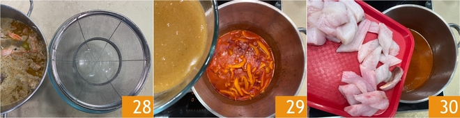 Enquanto isso, o caldo estará pronto, então coe-o 28. Adicione à sopa cerca de 800 g de caldo 29, depois mergulhe os pedaços de tamboril e continue cozinhando por 10 minutos. Após esse tempo, adicione também os filés de trilhas e galinheta, misture delicadamente e cozinhe por mais 5 minutos 30.