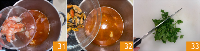 Por último, adicione os camarões 31 e os mexilhões 32. Ajuste o sal e a pimenta e cozinhe por mais um minuto. Enquanto isso, pique as folhas de salsa 33.