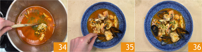 Neste ponto, desligue o fogo, perfume com bastante salsa picada e dê uma última mexida 34. Sirva e decore com os mexilhões inteiros reservados 35 e mais salsa a gosto. Sua sopa de peixe está pronta para ser servida 36!