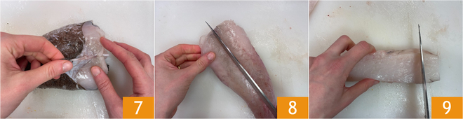 Passe para o tamboril: remova a barbatana e a pele 7 (estas podem ser descartadas pois não são usadas para o caldo), depois remova a espinha dorsal 8 e corte a polpa em pedaços 9.