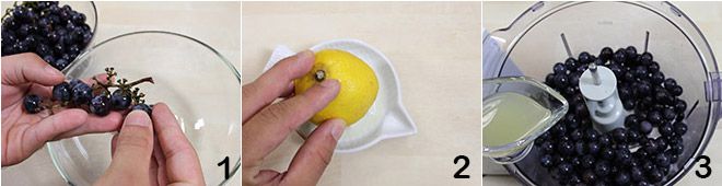 Para preparar o sorvete de uva Isabel, separe todas as uvas dos cachos e coloque-as no copo de um liquidificador 1. Esprema meio limão 2 e adicione o suco obtido às uvas 3, então bata tudo até obter um purê.
