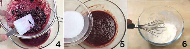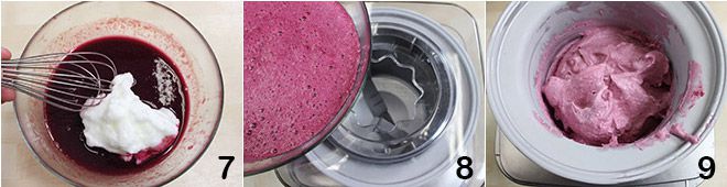 e adicione-a à preparação de uva Isabel, tomando cuidado para não desmanchar 7; misture bem com a ajuda de um batedor até obter uma mistura homogênea. Despeje tudo na sorveteira 8 e deixe misturar por pelo menos 35-40 minutos, ou até obter um sorvete cremoso 9. Sirva o sorvete de uva Isabel bem gelado.