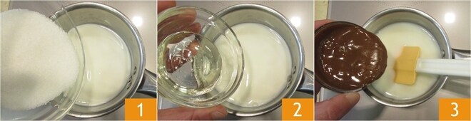 Para preparar o sorvete de avelã, coloque o leite em uma panela junto com o açúcar 1 e a glicose 2 e misture em fogo baixo. Adicione a pasta de avelã 3.