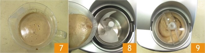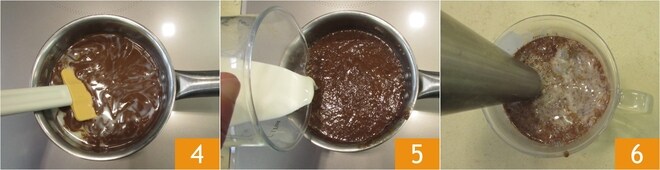 Continue misturando até dissolver tudo 4, depois desligue o fogo e adicione o creme de leite 5. Transfira tudo para um copo e bata com um mixer de imersão 6.