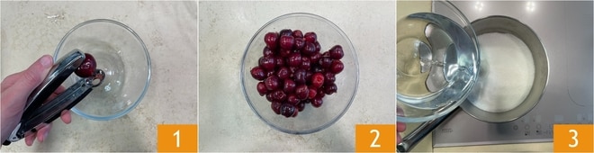 Para preparar o sorbetto de cereja, primeiro lave bem e tire os caroços 1. Ao todo, você precisará de 700 g de cerejas sem caroço, sem cabinho 2. Em uma panela, adicione o açúcar e a água 3.