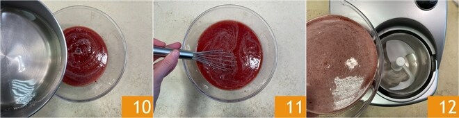 Adicione a calda, agora em temperatura ambiente 10 e misture 11. Despeje a mistura na sorveteira e ligue-a 12.