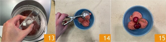 Assim que estiver bem homogêneo e cremoso 13, transfira para o freezer por pelo menos 15-20 minutos. Com a ajuda de uma colher de sorvete, transfira o sorbetto para uma tigela 14, decore com cerejas frescas e sirva 15.
