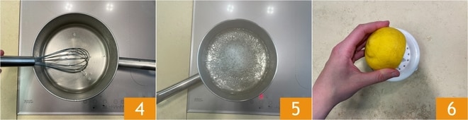 Misture com um batedor 4 e leve para ferver 5; depois deixe esfriar completamente. Esprema o suco do limão 6.