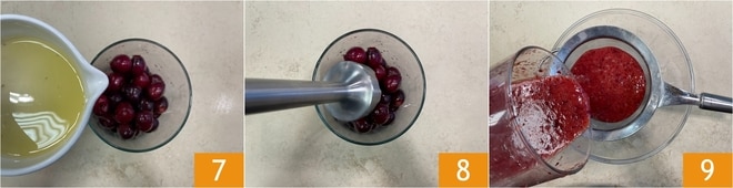 Transfira as cerejas para um recipiente alto e estreito, adicione o suco de limão 7 e bata com um mixer de imersão 8. Depois de obter um purê, passe-o por uma peneira fina 9, recolhendo-o em uma tigela.
