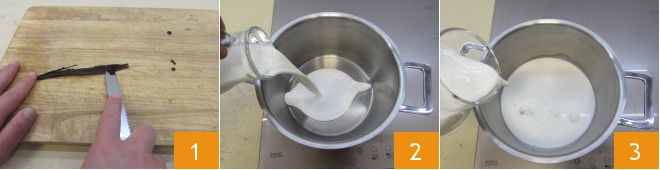 Para preparar o sorvete de creme, pegue a baunilha, corte-a e raspe a polpa interna com a lâmina de uma faquinha 1. Reserve. Em seguida, pegue uma panela de bordas altas e coloque o leite 2 e o creme 3.