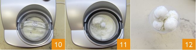 Deixe a sorveteira funcionar por cerca de 30 minutos 10, até que fique bem denso e cremoso 11. Neste ponto, transfira para um recipiente baixo e largo, de preferência de vidro ou aço, e coloque-o fechado no congelador por pelo menos 3 horas antes de consumir. Seu sorvete de creme está pronto para ser saboreado 12!