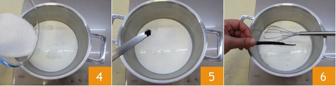 Adicione então o açúcar 4 e as sementes da baunilha 5, juntamente com a própria baunilha 6 para aromatizar a mistura.