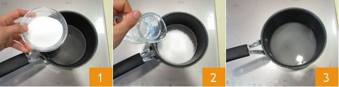 Para preparar o sorvete de pistache sem sorveteira, comece pelo xarope: em uma panelinha, coloque o açúcar 1, a água 2 e acenda o fogo baixo 3.