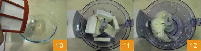 Neste ponto, retire os cubos da forma 10 e transfira-os para um processador de alimentos 11. Bata tudo até obter uma mistura cremosa 12,