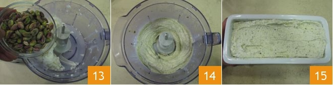 adicione os pistaches 13 e bata novamente até obter um creme liso 14. Transfira para um recipiente (de preferência de alumínio, cerâmica ou vidro. Evite plástico) 15 e coloque no freezer por pelo menos 6 horas. Na hora de servir, retire do freezer 5-10 minutos antes e com uma colher trabalhe, raspando aos poucos até conseguir misturar para recuperar o estado cremoso. Para obter uma consistência ainda mais cremosa, você pode passar o sorvete novamente no mixer com lâminas.