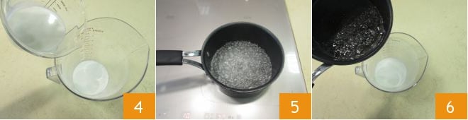 Enquanto isso, em uma jarra, coloque tanto o leite quanto o creme de leite 4. Assim que o xarope começar a ferver 5, desligue o fogo e deixe esfriar um pouco. Despeje o xarope dentro da mistura de leite e creme de leite 6