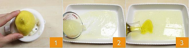Para preparar o souvlaki de porco, comece preparando a marinada que servirá para aromatizar a carne: esprema o suco dos limões 1, em uma assadeira retangular de cerca de 23x35 cm coloque o suco dos limões 2, o óleo 3,