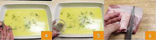 o alecrim 4, o orégano 5, tempere finalmente com sal e pimenta. Agora, cuide da carne. Pegue o lombo de porco, retire a parte gordurosa com uma faca bem afiada 6,