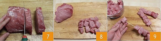 corte em fatias de cerca de dois centímetros de espessura 7 e depois corte em cubos de aproximadamente 2 cm x 2 cm 8, cada pedaço deve ter um peso de cerca de 15 gramas. Em seguida, coloque os cubos de carne em espetinhos de madeira com 20 cm de comprimento 9. Cada espetinho pode conter 5 pedaços de carne, com essas quantidades você obterá 12 espetinhos.