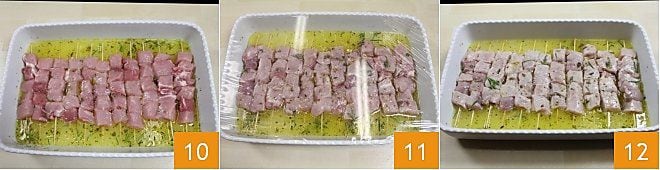 Coloque os souvlakis de porco na emulsão previamente preparada 10, cubra a assadeira com filme plástico 11 e leve à geladeira para marinar por pelo menos 30 minutos. Após o tempo necessário, retire a assadeira da geladeira 12