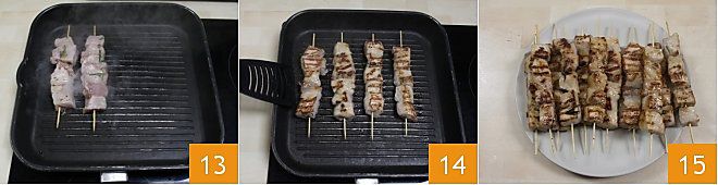 e proceda com o cozimento: coloque no fogo uma grelha de ferro fundido e aqueça bem, grelhe os espetinhos cuidando para cozinhá-los de cada lado 13. A carne por dentro deve estar tenra mas bem cozida e por fora devem se formar as típicas listras de grelha 14, levará cerca de 15 minutos. Sirva os souvlakis de porco 15 ainda quentes, acompanhados pelo tzatziki e a típica salada grega.