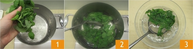 Para preparar o espaguete à parmigiana com coulis de tomatinhos, a primeira coisa a fazer é preparar a manteiga de manjericão que será usada na mistura. Coloque no fogo uma panela cheia de água, salgue a 10% e leve à fervura. Mergulhe as folhas de manjericão 1, escalde por 30 segundos 2 e depois, usando uma escumadeira, escorra e transfira para água com gelo 3. Este passo serve para interromper o cozimento e manter a cor das folhas viva.