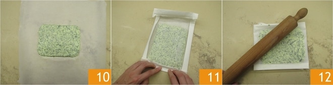 Tente obter uma forma regular 10. Coloque outra folha de papel manteiga por cima e feche bem as bordas ao redor da manteiga 11. Achate ainda mais com um rolo 12 e transfira para a geladeira. A manteiga de manjericão se solidificará durante o tempo que você levará para preparar as outras etapas.
