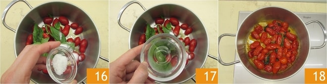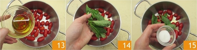 Passe agora a preparar o coulis de tomatinhos. Despeje os tomatinhos em uma panela, adicione o óleo 13, as folhas de manjericão 14 e o açúcar 15.
