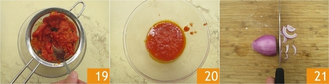 Passe tudo por uma peneira 19, para coletar o suco em uma tigela 20. O coulis está pronto: reserve e prepare as berinjelas. Descasque a cebola e corte-a em fatias 21, será usada no cozimento.