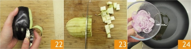 Retire as pontas das berinjelas e descasque-as 22. Corte-as agora em cubos regulares de cerca de 1 cm 23. Em uma frigideira, despeje 100 g de óleo, a cebola 24 e o alho cortado em fatias, sem o miolo. Adicione uma pitada de sal e deixe amolecer.