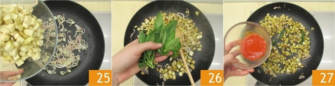 Adicione as berinjelas 25, mexa bem e salgue novamente; desse modo, as berinjelas liberarão água e cozinharão mais facilmente. Deixe refogar por 10 minutos em fogo médio. Quando as berinjelas começarem a caramelizar, adicione o manjericão 26. Cozinhe por mais 5 minutos, adicione cerca de 50 g de coulis 27, misture e cozinhe por mais 2-3 minutos.