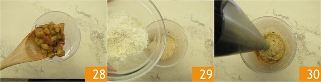 Transfira as berinjelas para o copo de um mixer de imersão 28. Adicione a farinha de rosca, o Parmesão 29, sal e pimenta. Bata tudo até obter um creme grosso e rústico 30.