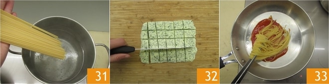 Cozinhe o espaguete em abundante água fervente, salgada a gosto, por metade do tempo indicado na embalagem 32. Enquanto a massa cozinha, retire a manteiga da geladeira e corte-a em cubos 34. Despeje o coulis restante em uma panela grande e transfira o espaguete para dentro dela, retirando-os com uma pinça 33.