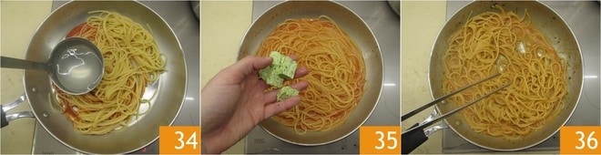 Adicione um pouco de água do cozimento 34. Salteie o espaguete e, quando estiver bem integrado, adicione cerca de 80 g de manteiga de manjericão 35. Misture bem para incorporar 36.