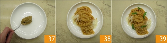 Agora sirva. Coloque o creme de berinjela na base do prato 37 e adicione o espaguete por cima. De um lado, coloque o Parmesão ralado, do outro o Pecorino ralado 38 e finalize com folhas de manjericão 39. Seu espaguete à parmigiana com coulis de tomate está pronto para ser servido!