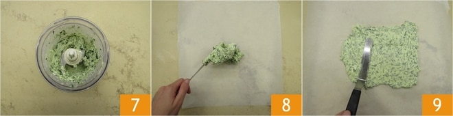 Bata tudo até obter um creme homogêneo 7. Transfira agora a mistura para uma folha de papel manteiga 8 e espalhe com uma espátula até formar uma camada fina 9.