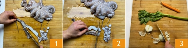 Para preparar os spaghetti alla chitarra com ragù de polvo, primeiro assegure-se de que o polvo esteja bem limpo, sem olhos e bico. Neste ponto, separe os tentáculos e divida-os ao meio 1, depois corte-os de modo a obter pedaços de cerca de meio cm 2. Prepare os vegetais para o refogado, fazendo um corte fino de cenoura, aipo e cebola 3.