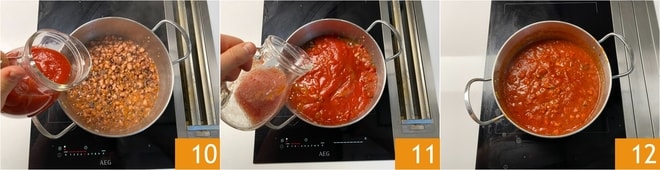 Assim que o álcool evaporar, adicione também o purê de tomate 10. Enxágue a jarra com um pouco de água e despeje na panela 11. Adicione apenas uma pitada de sal e cozinhe por 40 minutos, até que o polvo esteja macio. Se necessário, você pode adicionar água se o molho engrossar e prolongar o cozimento.