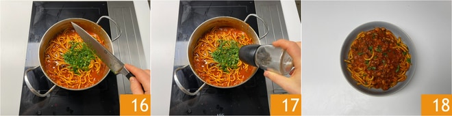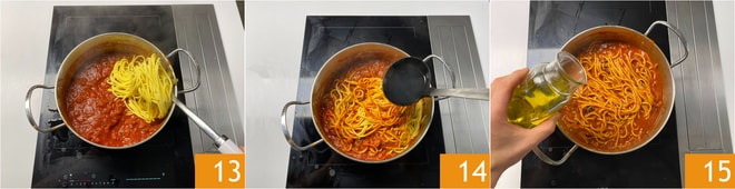 Cozinhe os spaghetti alla chitarra em água abundante fervente e salgada, escorra-os e transfira-os para o molho 13. Adicione pouca água do cozimento 14 e um fio de azeite 15.