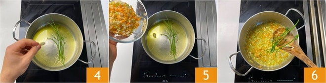 Separe os talos das folhas de salsa e pique estas últimas. Reserve, cobrindo com um guardanapo úmido. Em uma panela grande, despeje um fio de azeite, adicione os talos de salsa e o dente de alho 4. Acenda o fogo e adicione também a mistura recém-preparada 5. Deixe tomar gosto e, assim que o refogado estiver bem murcho, elimine os talos de salsa e o alho 6.
