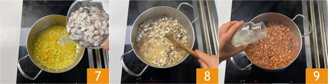 Despeje então os cubos de polvo 7 e misture. Cozinhe por alguns minutos 8 e assim que a água evaporar, regue com o vinho branco 9.