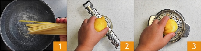 Para preparar os spaghetti ao limão, a primeira coisa a fazer é mergulhar os spaghetti em água fervente com sal 1. Enquanto os spaghetti cozinham, rale a casca dos limões 2 e extraia o suco 3.