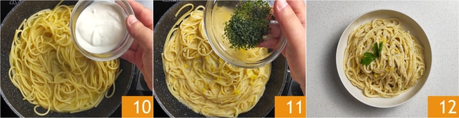 Adicione o creme de leite 10 e mexa para incorporá-lo aos outros ingredientes. Desligue o fogo e acrescente a salsinha picada 11, o restante da casca de limão ralada, uma pitada de pimenta e misture por alguns minutos. Os spaghetti ao limão estão prontos para serem servidos 12.