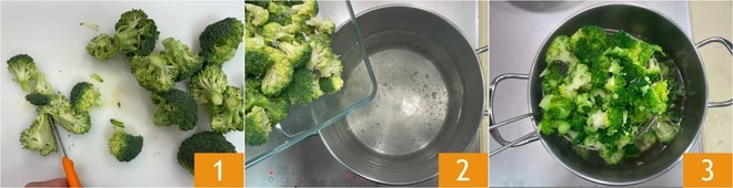 Para preparar o espaguete com brócolis e camarões, primeiro limpe o brócolis e separe as floretes 1. Leve uma panela com água salgada para ferver, adicione as floretes 2 e cozinhe por 5 minutos; elas devem ficar macias, mas ainda crocantes. Escorra os brócolis 3 e reserve a água do cozimento, que será usada para cozinhar a massa.