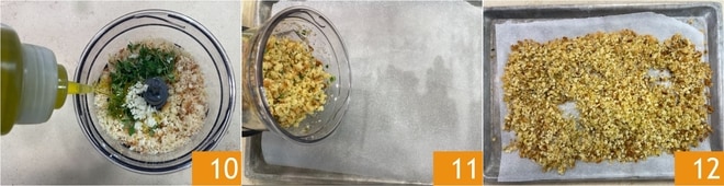 Finalmente, adicione um fio de azeite 10 e uma pitada de sal. Triture novamente para misturar tudo, depois distribua as migalhas aromatizadas em uma assadeira forrada com papel manteiga 11. Asse em forno estático pré-aquecido a 180° por 10-15 minutos 12.